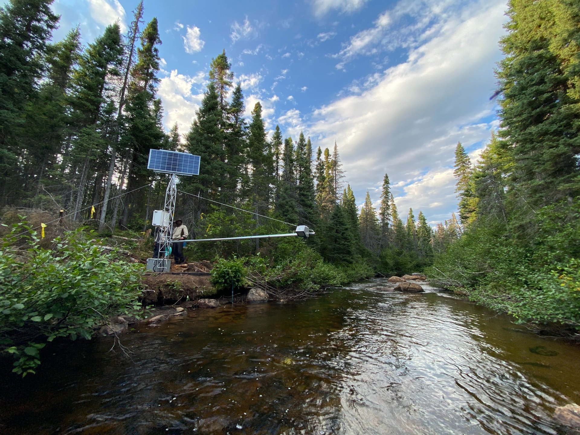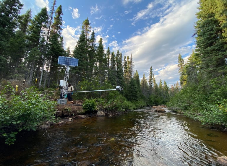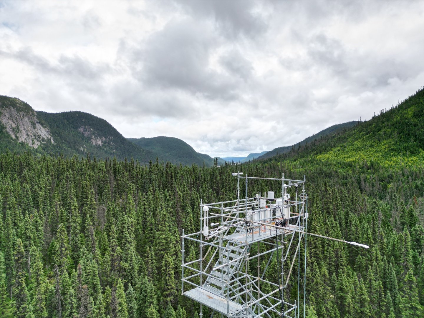 We are very active in two experimental catchments within Quebec’s boreal forest: the Montmorency Forest, in the heart of the Laurentian Mountains, in a balsam fir–white birch stand, where our team has been operating flux towers since 2015 in collaboration with Professor François Anctil; and the Bernard River watershed, on the North Shore, where we have been running a flux tower since 2018 in collaboration with Hydro-Québec, Professor Julie Talbot, and Professor Manuel Helbig. These installations allow us to monitor water and energy exchanges between the boreal forest and the atmosphere, in particular to better understand the components of evaporation (transpiration, evaporation of intercepted water, and soil evaporation) and their impact on river discharge.