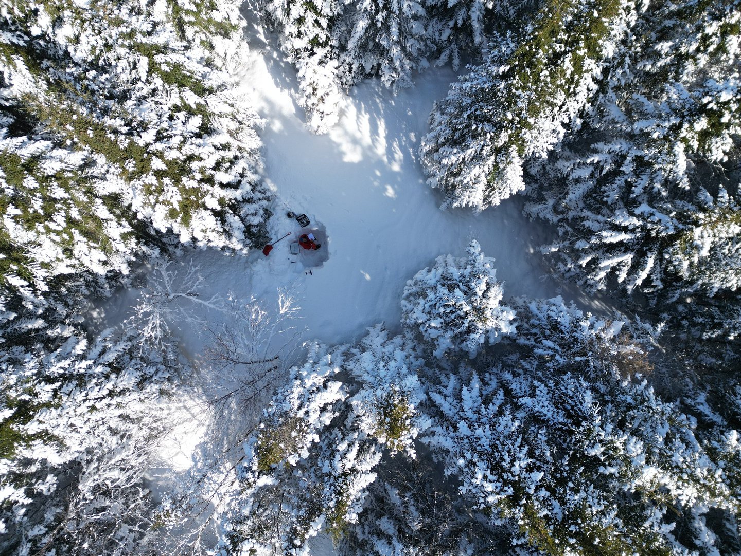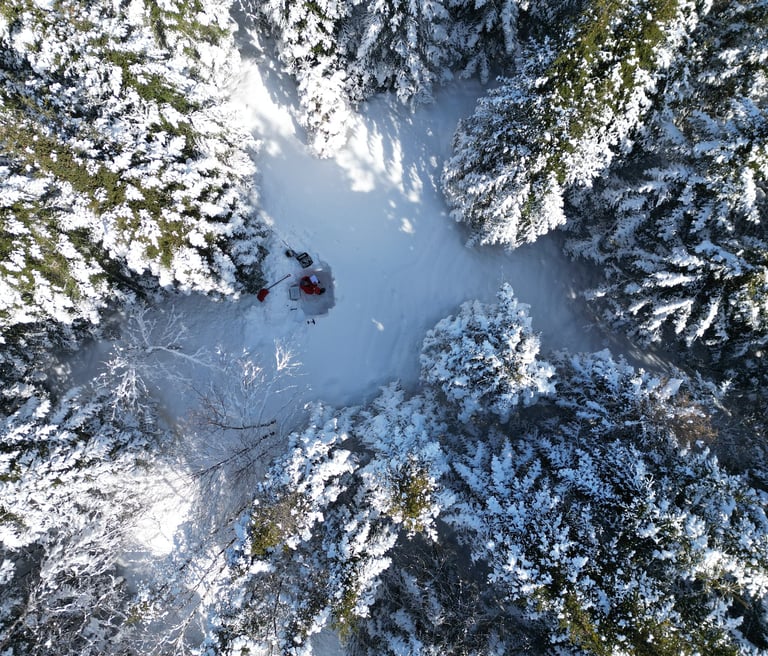Dmitry Pershin au sein d'un puits de neige à la Forêt Montmorency - Hiver 2024 (crédit photo : Pierre-Erik Isabelle et Emmanuelle Barrette)